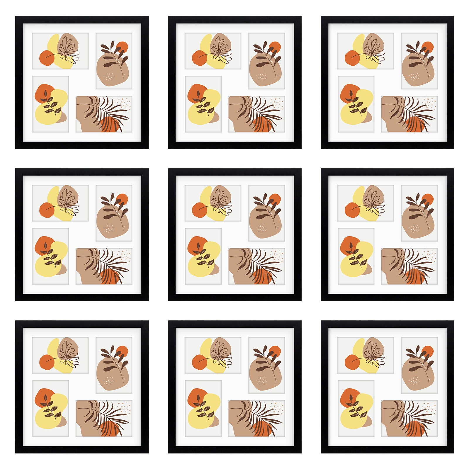 - INCLUDES: Nine 12x12 black wooden frames with a 12x12 white mat, featuring four 4x6 openings (opening size: 3.5x5.5).