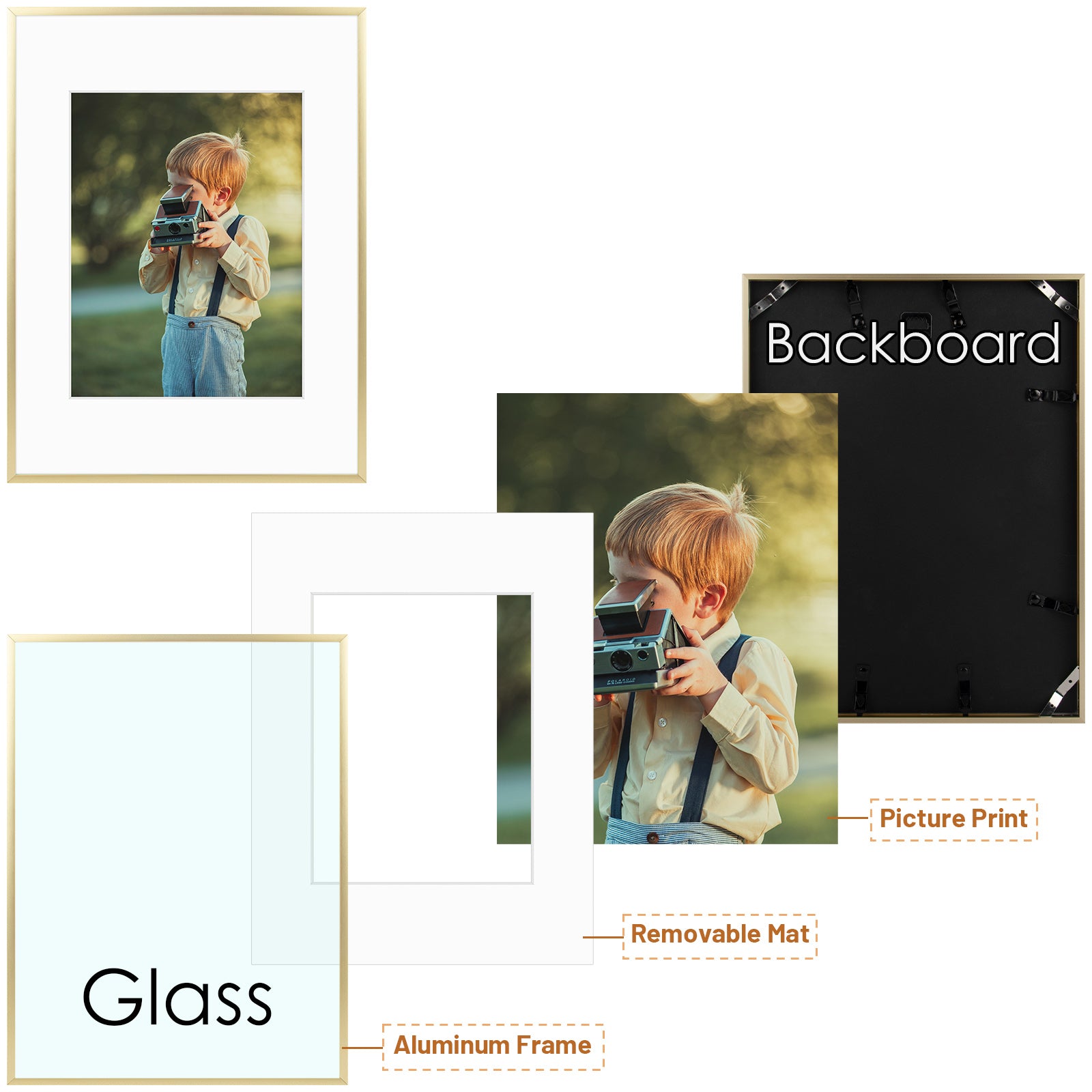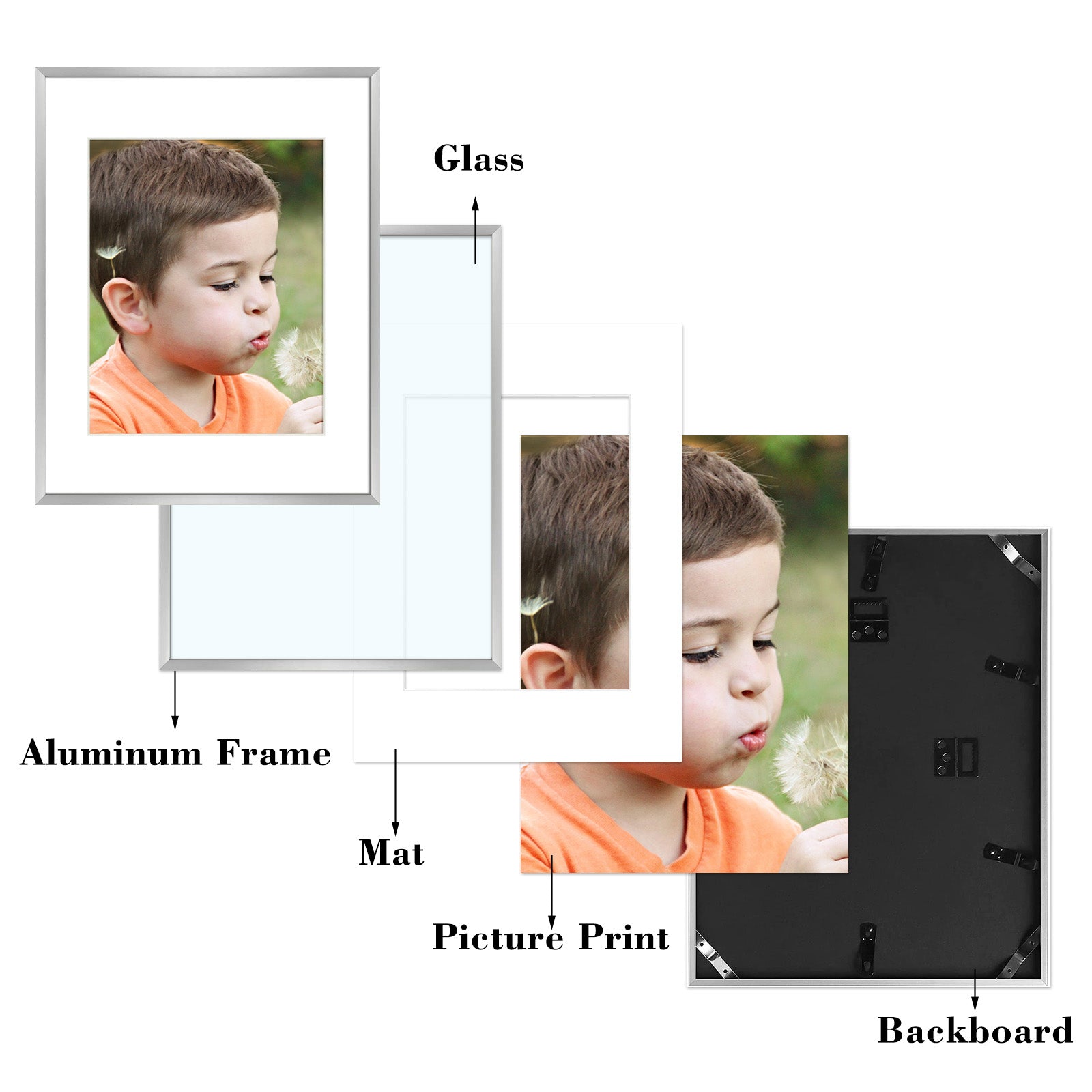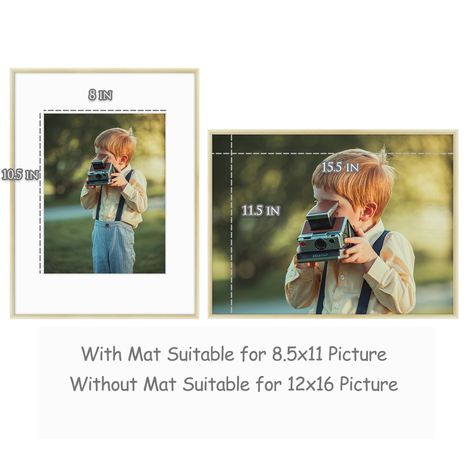 12x16 aluminum picture frame in our popular colors. White mat board included for 8.5x11 photo. High quality and sturdy metal built to last. Perfect for framing your story. Get free shipping within the contiguous United States.