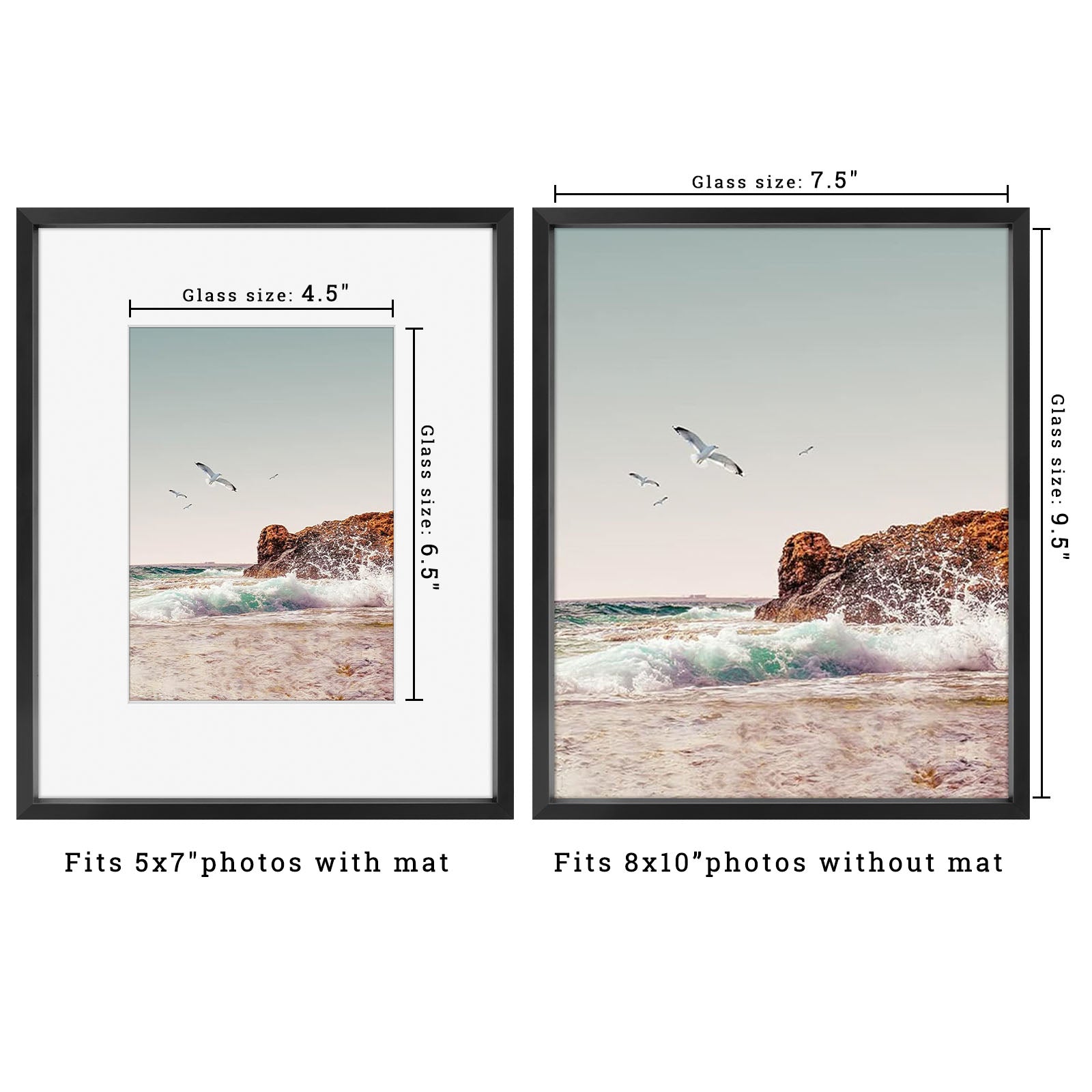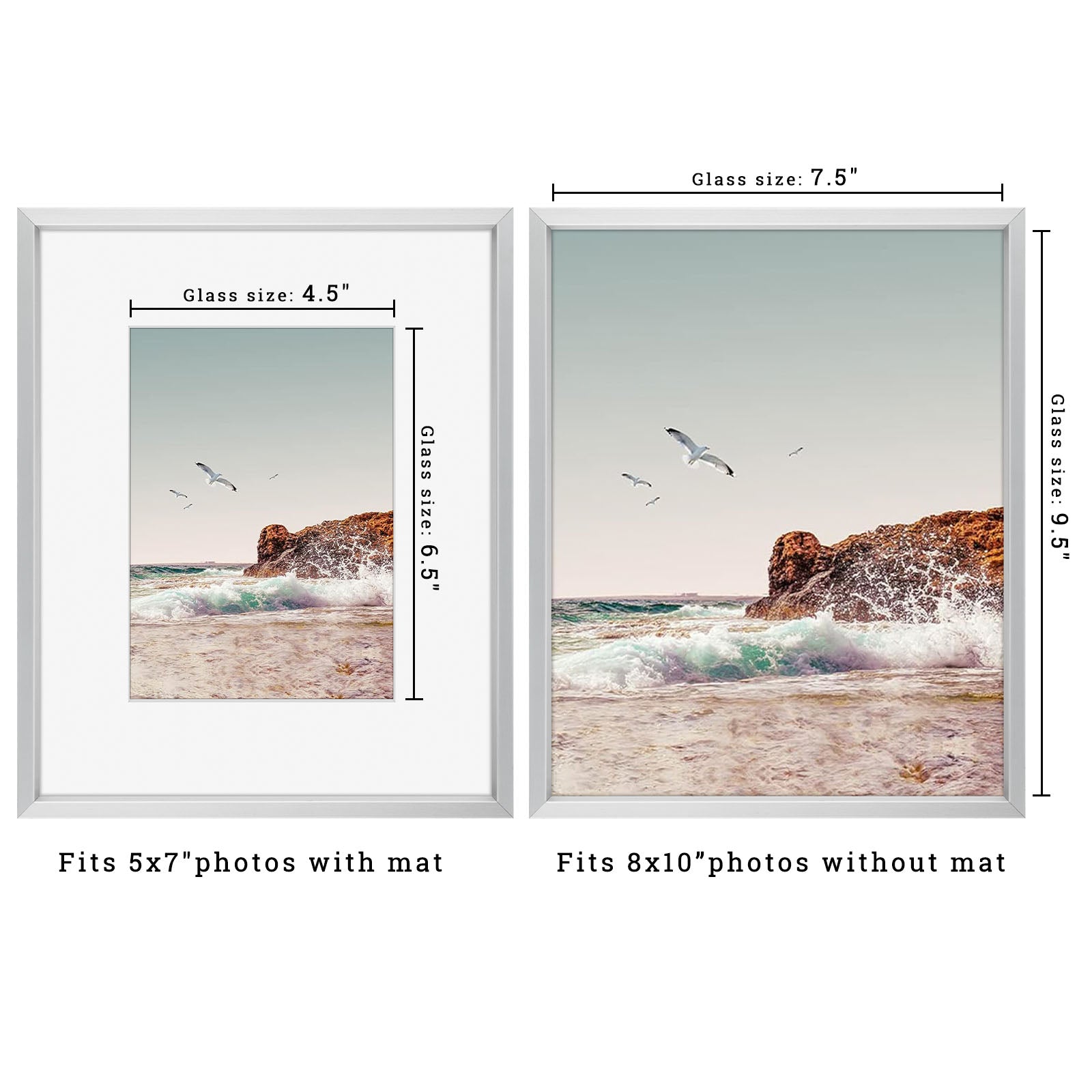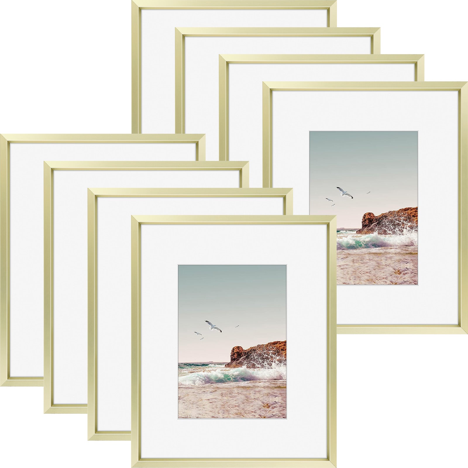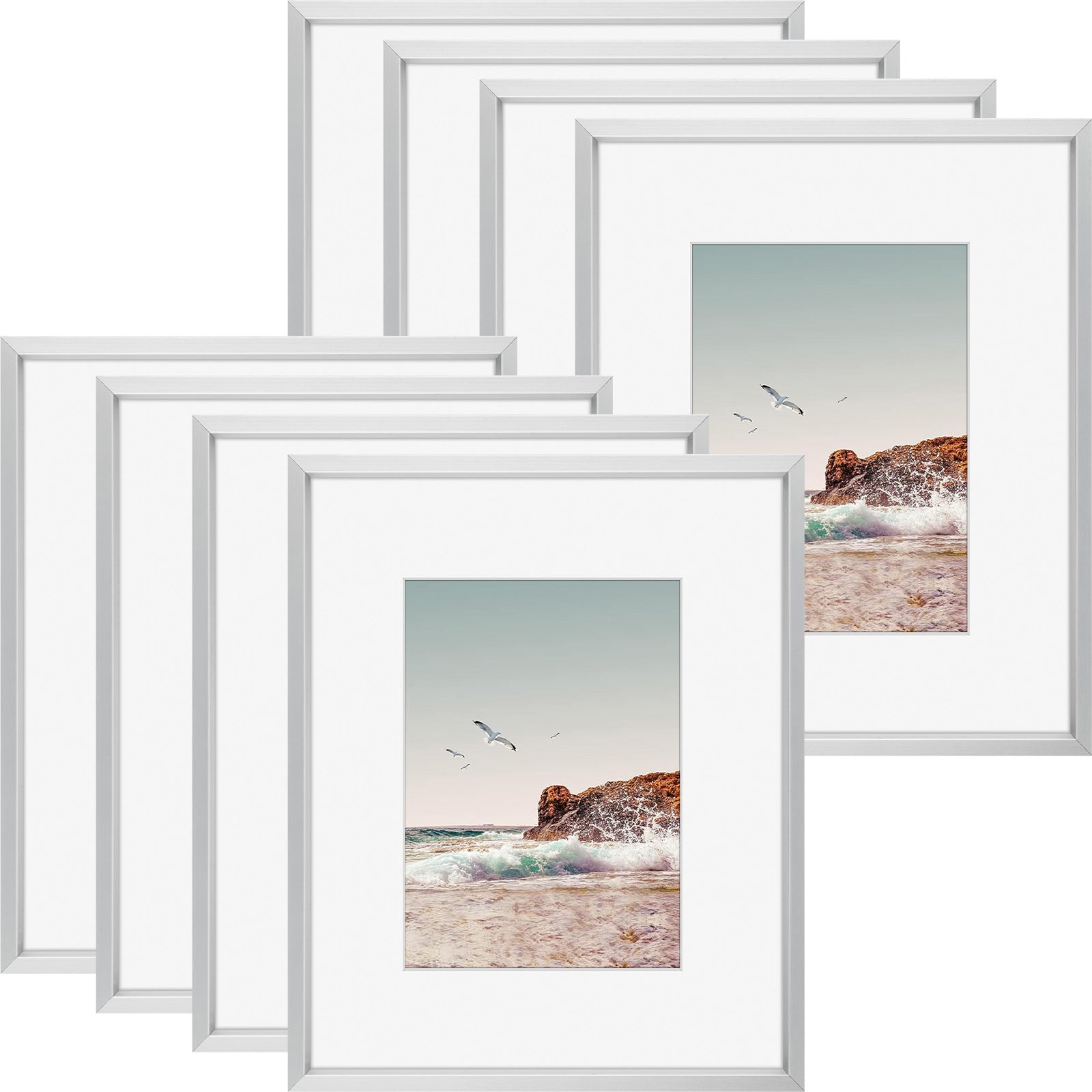 8x10 aluminum picture frame in our popular colors. White mat board included for 5x7 photo. This is a wholesale pack of 8 for bulk use. High quality and sturdy metal built to last. Perfect for framing your story. Get free shipping within the contiguous United States.