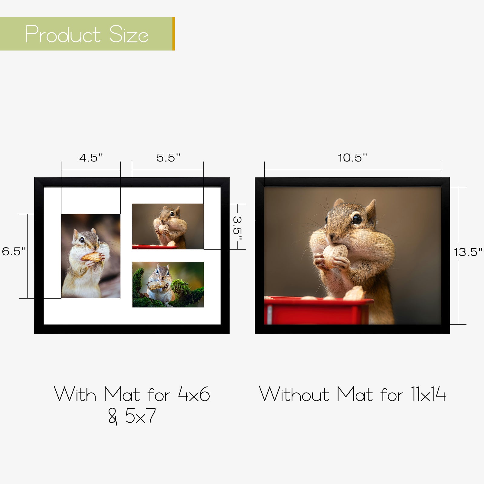 - Frame Size: 11x14 inches, for one 5x7 and two 4x6 photos.