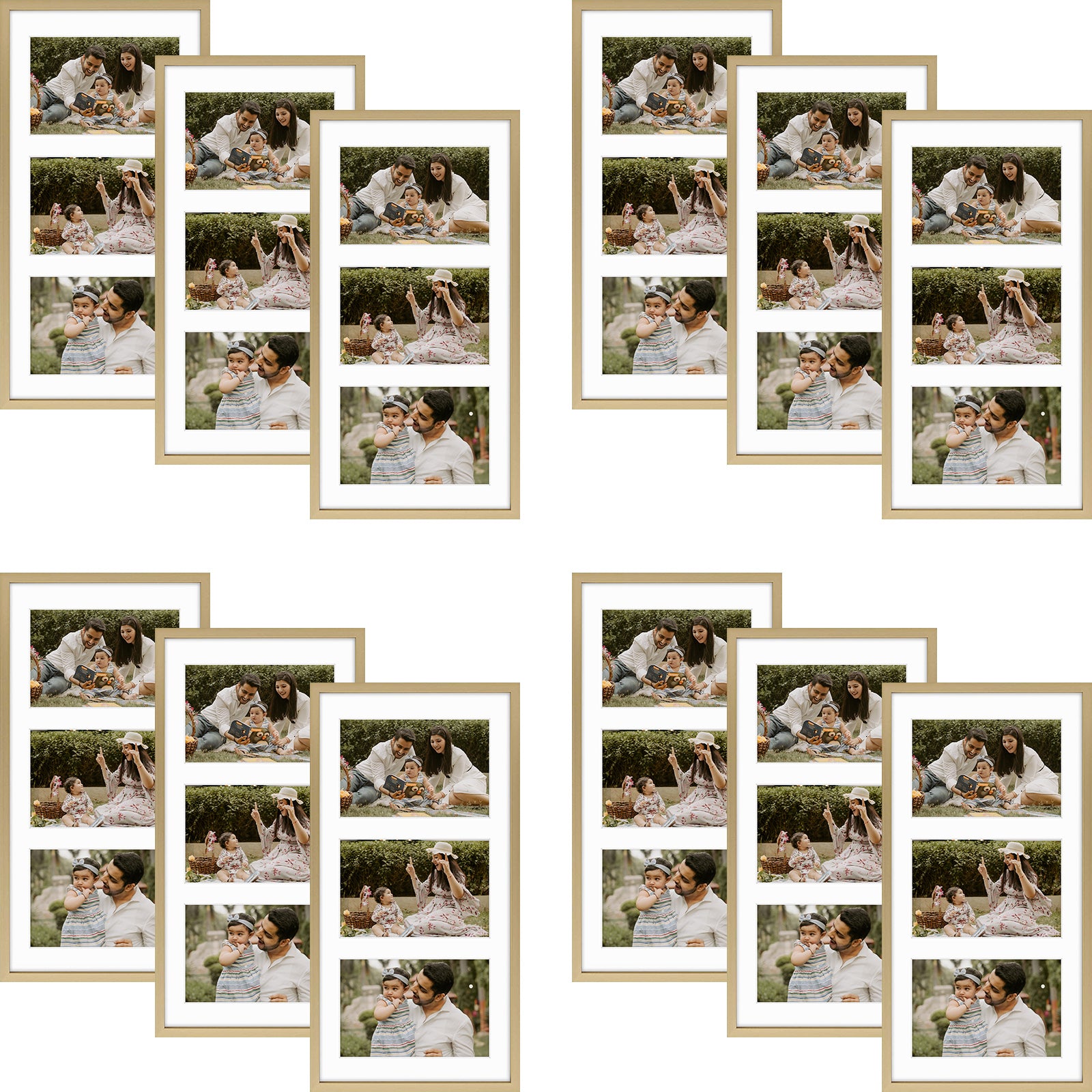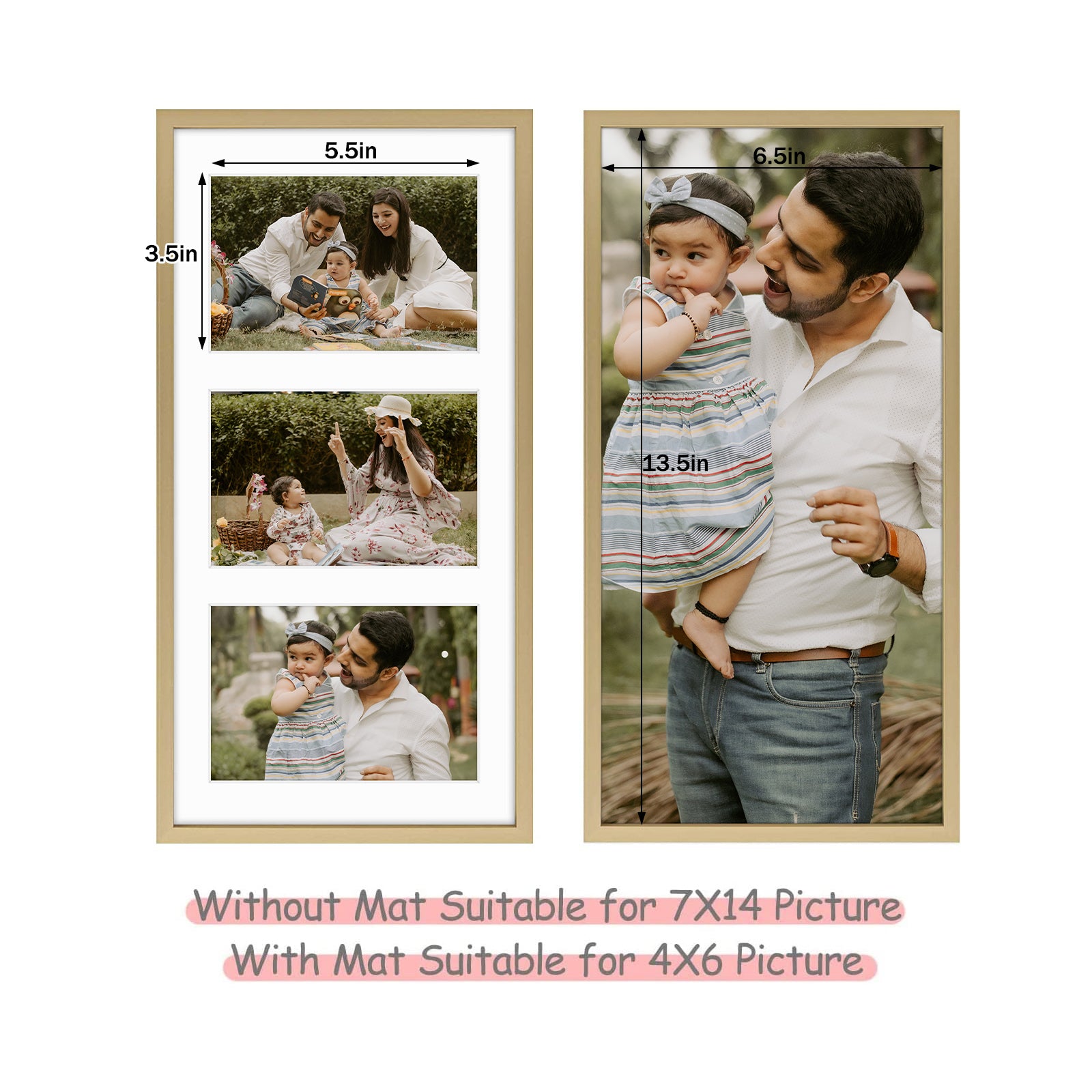 7x14 collage picture frame in our popular gold color and each frame comes with a white mat board included for three 4x6 photos. High quality and sturdy metal built to last. Perfect for framing your story. Get free shipping within the contiguous United States.