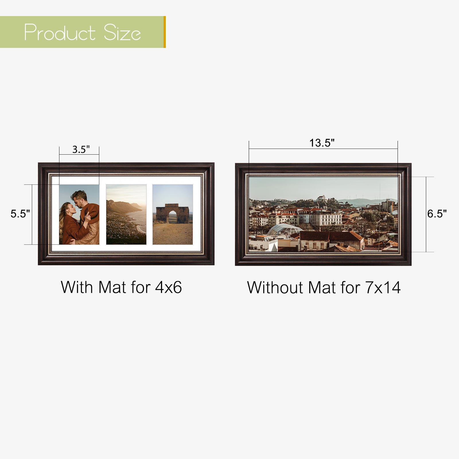 - Versatile Display: Designed to hold three 4x6-inch photos with a white mat (each opening size: 3.5x5.5 inches) or one 7x14-inch photo without the mat, offering flexible display options.