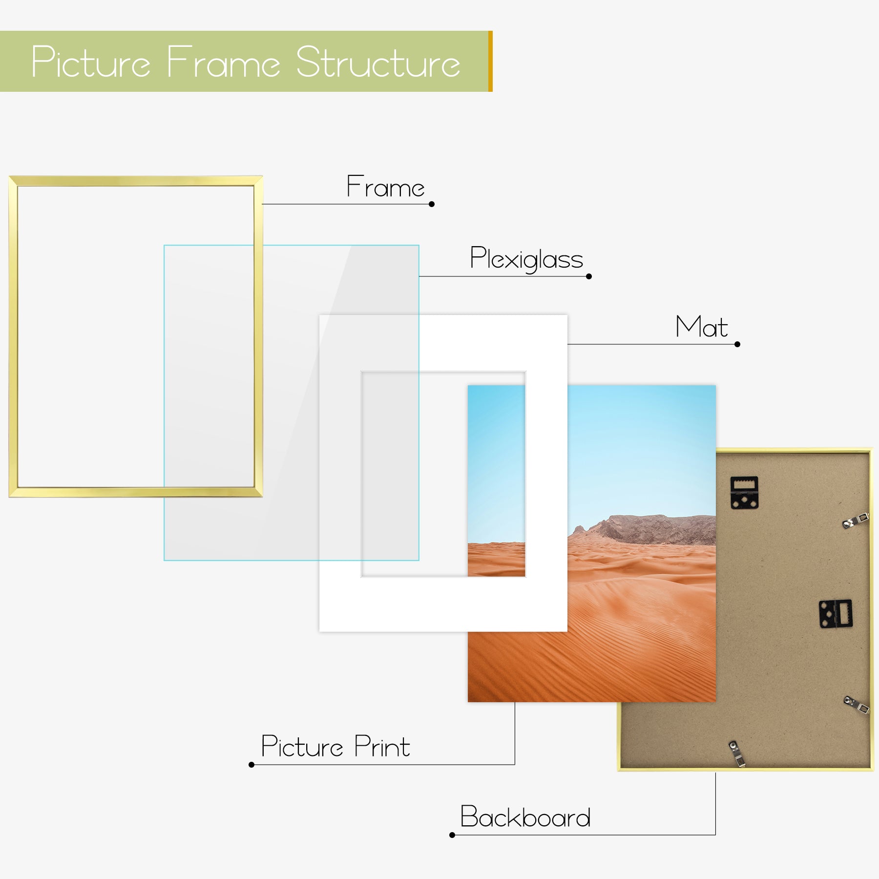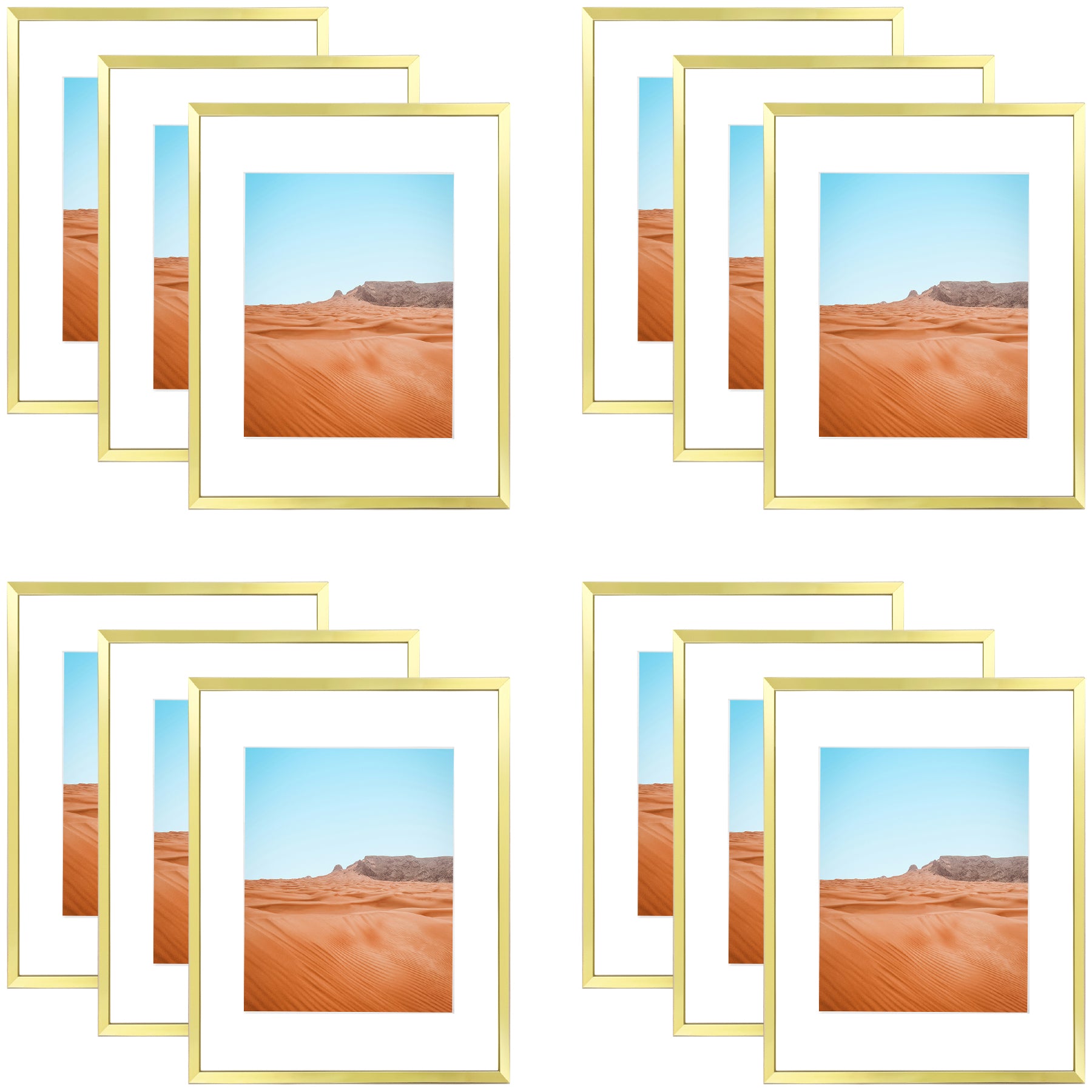 - Complete Frame Set: Includes twelve 11x14 gold picture frames with white mats. The sleek and modern design is ideal for displaying photos, certificates, art prints, posters, and more in homes, offices, studios, or galleries.